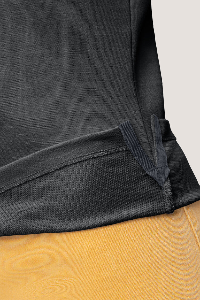 Funktionelles T-Shirt für Damen, mit feminin geschnittenem V-Ausschnitt und modisch schmalem Halsbündchen, in edler Single-Jersey-Optik und Nackenband. Kragennaht und Innenseite der Seitenschlitze sind mit kontrastfarbigem Gewebeband belegt. Hergestellt durch ein spezielles Strickverfahren, bei dem zwei Garne zu einem Cotton Tec-Double-Face-Material verarbeitet werden. Dabei entsteht an der Außenseite eine besonders feine Single-Jersey-Oberfläche aus langstapeliger, gekämmter und ringgesponnener Baumwolle und an der Innenseite eine Mesh-Lage aus der Funktionsfaser TRIACTIVE. Dadurch ist das T-Shirt temperaturregulierend, weil Feuchtigkeit schnell an die Außenseite transportiert wird, wo sie verdunstet. Gedrucktes HAKRO Necklabel für höchsten Tragekomfort und gewebtes HAKRO Flaglabel an der linken Seitennaht.
