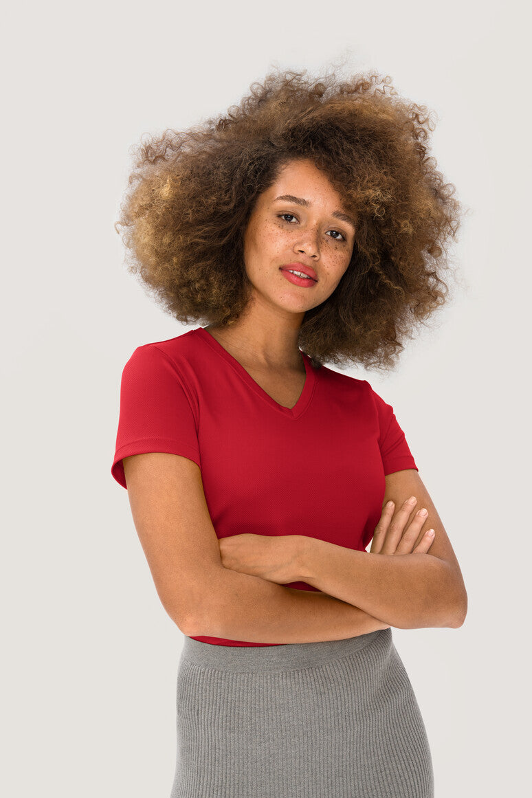 Funktionelles T-Shirt für Damen, mit feminin geschnittenem V-Ausschnitt, verlängertem, abgerundetem Rückenteil und Nackenband. Hergestellt aus COOLMAX® PRO - einer Funktionsfaser für extreme Belastungen. Temperaturregulierend durch schnellen Transport der Feuchtigkeit an die Textilaußenseite, wo sie sofort verdunsten kann. Gedrucktes HAKRO Necklabel für höchsten Tragekomfort und gewebtes HAKRO Flaglabel an der linken Seitennaht.
