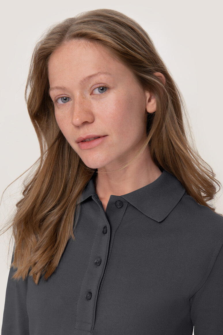 Besonders strapazierfähiges, langärmeliges Poloshirt für Damen, mit hochwertig verarbeiteter, modisch schmaler 4-Loch-Knopfleiste mit extra haltbar angenähten, bruchsicheren Knöpfen, Ton-in-Ton mit dem gelaserten HAKRO Schriftzug. Mit Ersatzknopf, Nackenband und doppelt geriegelten Seitenschlitzen. Die Rippstrickbündchen an den Ärmeln sind durch den LYCRA®-Anteil besonders formstabil. Leasingkoller zur einfachen Kennzeichnung in der gewerblichen Wäscherei und Aufhängebänder im Saum. Hergestellt aus schwerem, besonders pflegeleichtem und funktionellem Piqué aus dem HAKRO Performance-Materialmix Mikralinar®. Gewebtes HAKRO Necklabel aus hochwertigem Kettsatin mit weichen, ultraschallgeschnittenen Bandkanten für höchsten Tragekomfort und gewebtes HAKRO Flaglabel an der linken Seitennaht.