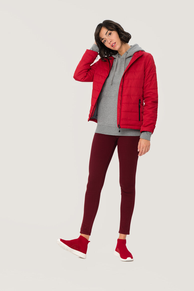 Wärmende Isolationsjacke für Damen mit elastischen Ärmelabschlüssen, hochwertigem Zwei-Wege-Frontreißverschluss mit Reißverschlussanhänger, funktioneller Innentasche und seitlichen Einschubtaschen mit Reißverschluss. Alle Reißverschlüsse von YKK®. Hergestellt aus atmungsaktivem Micro-Ripstop-Außenmaterial mit Wattierung aus wärmender und pflegeleichter Kunstfaser. Gewebtes HAKRO Necklabel aus hochwertigem Kettsatin mit weichen, ultraschallgeschnittenen Bandkanten für höchsten Tragekomfort und gewebtes HAKRO Flaglabel an der linken Seitennaht.