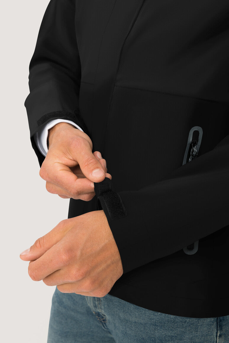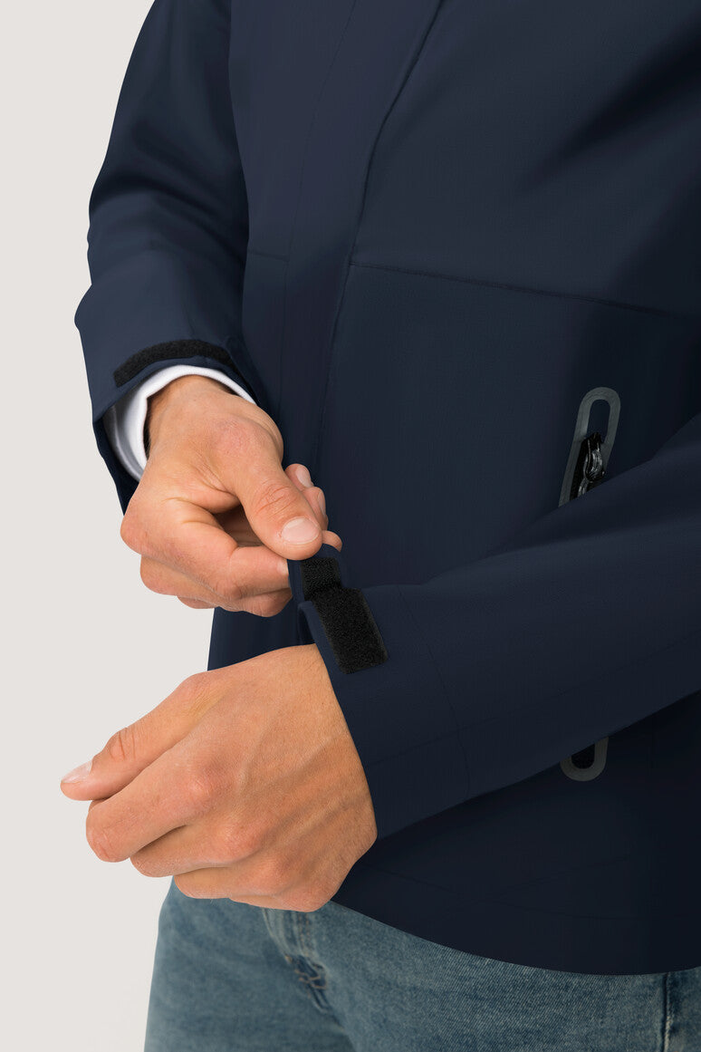 Atmungsaktive, wasser- und winddichte Aktivejacke mit getapten Nähten, abnehmbarer und regulierbarer Kapuze mit Schild, verlängertem, abgerundetem Rückenteil, hochwertigem Zwei-Wege-Frontreißverschluss mit Windschutzpatte und Reißverschlussgarage, wasserdichten Reißverschlüssen an den Taschen und Reißverschlussärmeltasche. Alle Reißverschlüsse von YKK®. Weitenverstellbarer Saumabschluss mit Tunnelkordelzug und Stoppern, weitenverstellbare Ärmelbündchen mit Klettband zum stufenlosen Regulieren. Hergestellt aus strapazierfähigem wasser- und winddichtem Obermaterial aus 2,5-Lagen-Laminat mit TRIACTIVE® PRO Technologie für maximale und zuverlässige Wasserdichtigkeit. Gewebtes HAKRO Necklabel aus hochwertigem Kettsatin mit weichen, ultraschallgeschnittenen Bandkanten für höchsten Tragekomfort und gewebtes HAKRO Flaglabel an der linken Seitennaht.