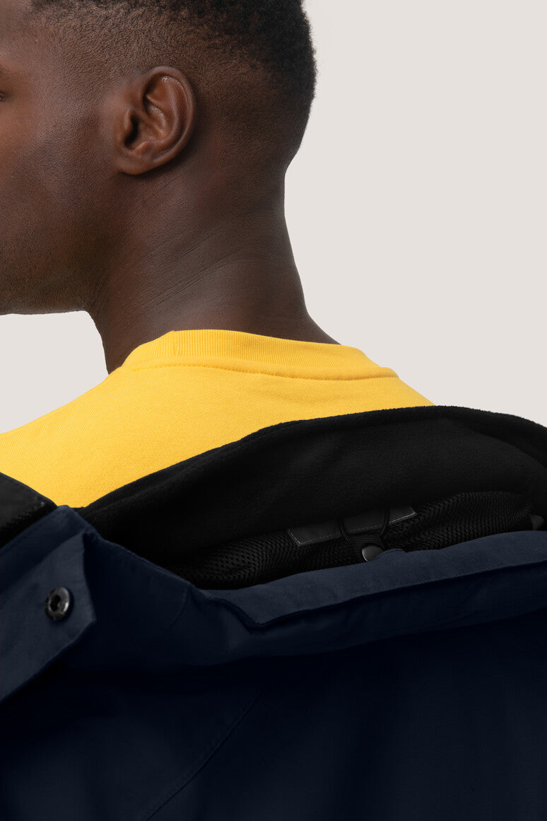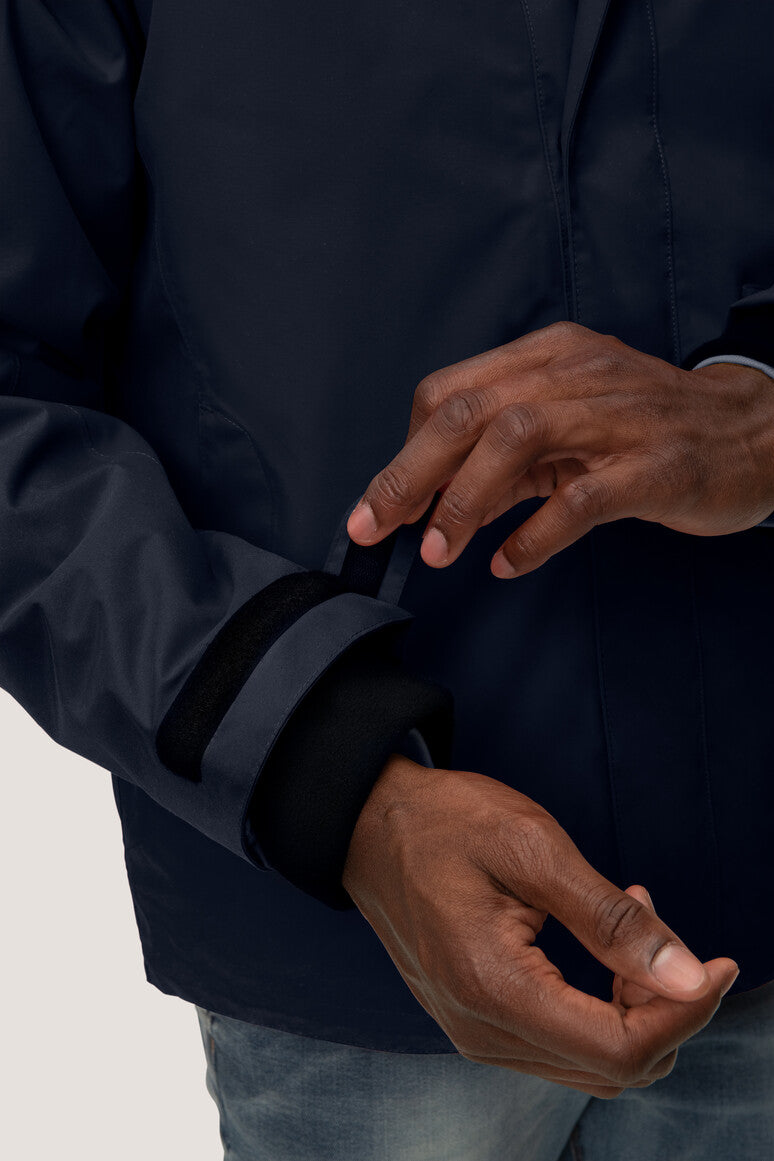 Atmungsaktive, wasser- und winddichte 3-in-1-Kombijacke mit getapten Nähten, separat tragbarer, wärmender Fleece-Innenjacke in Schwarz (bei Außenjacke in Farbe Tinte, Fleece-Innenjacke in Tinte). Abnehmbare Kapuze mit Schild, im Kragen verstaubar. Kapuze und Saumabschluss mit Tunnelkordelzug und Stoppern in der Weite verstellbar. Hochwertiger Zwei-Wege-Frontreißverschluss mit doppelter Windschutzpatte, Innentasche, zwei praktische Außentaschen mit Reißverschluss, weitenverstellbare Ärmelbündchen mit Klettverschluss zum stufenlosen Regulieren. Fleece-Innenjacke mit seitlichen Einschubtaschen, gefütterten Ärmeln, weitenverstellbarem Bund mit Tunnelkordelzug und Stoppern. Alle Reißverschlüsse von YKK®. Hergestellt aus strapazierfähigem wasser- und winddichtem Obermaterial aus 2-Lagen-Laminat mit TRIACTIVE® PRO Technologie für maximale und zuverlässige Wasserdichtigkeit. Gewebtes HAKRO Necklabel aus hochwertigem Kettsatin mit weichen, ultraschallgeschnittenen Bandkanten für höchsten Tragekomfort und gewebtes HAKRO Flaglabel an der linken Seitennaht.
